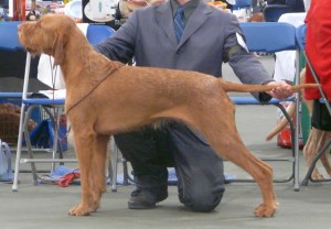 Last Sunday also saw the second Hungarian Wirehaired Vizsla Association show of the year, this time at the Kennel Club Building near Coventry. A 5 AM start (in total darkness) left both the dogs and the humans a bit discombobulated all round, and Mingus was evidently still a bit confused when he hit the show ring 4 and a half hours later since, at first, he appeared to entirely forget what the command “stand” was supposed to mean…a few gentle reminders from Tim eventually had him back on track and he trotted away with a respectable 2nd Puppy Dog award.