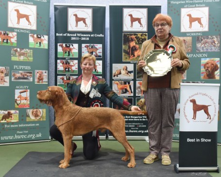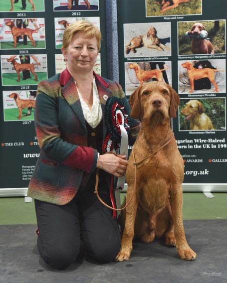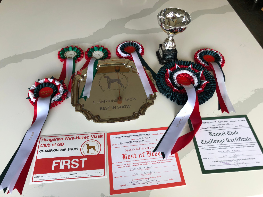 Show Champion Belatarr Kodiak’s amazing run continued with a tremendously exciting day at the Hungarian Wirehaired Vizsla Club of Great Britain Championship where he was awarded his 5th CC and then an incredible Best in Show under the hugely experienced Hungarian international Vizsla judge, Dr Zsuzsanna Balogh.