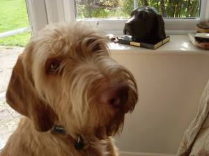 “Upstanding male, who is very hard ignore and presents a beautiful picture when standing. Strongly made dog, with good bone and substance. Masculine but not coarse well furnished head, with well set oval eyes giving a gentle expression. Good length of neck, slightly arched leading into well placed shoulders. Deep chest with elbows tight to body. Straight forelegs and good neat feet. Moderately sprung ribs set well back into a short loin. Superbly muscled hindquarters which he uses to advantage to power around the ring with great drive and ever so sound fore and aft. Added to this an excellent wire coat with first class presentation, I could not deny him BOB & G2. “