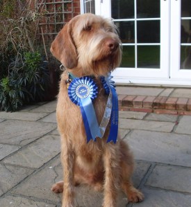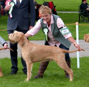“I make no secret of the fact that I have liked this bitch before. This is the third time I judged her, first time she wasn’t ready, second time she was the best bitch but boy look at her now! Now the finished package and am very surprised that she is still wanting her third CC. So very feminine in outline & outlook, such a pretty head & expression, I love her type, she is balanced & quality & is everything I want in a Hungarian Wirehaired bitch. She moved so true on well boned legs & feet, excellent neck & shoulders, strong topline & well set tail, good depth of chest, moved with ease & style covering the ground with an excellent head carriage & tailset, the bonus is that she has an excellent coat of the correct harshness & a beard, not an overlarge one, as I am know to prefer less, but just enough for perfection, her muscletone just gleamed on a sunny day, even though we were inside, when the sun caught her going round in profile, it completed the picture. Thrilled to give her the CC & BIS“