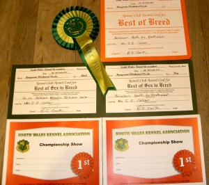 A fantastic day for Belatarr at the South Wales Kennel Association Championship show under breed specialist judge, Bev Smith: Sh Ch Belatarr Mahalia Jackson was awarded Best Bitch whilst her baby brother Belatarr North by Northwest took Best Dog and was then awarded Best of Breed – making a second time that Belatarr has now won the “Championship Double”.