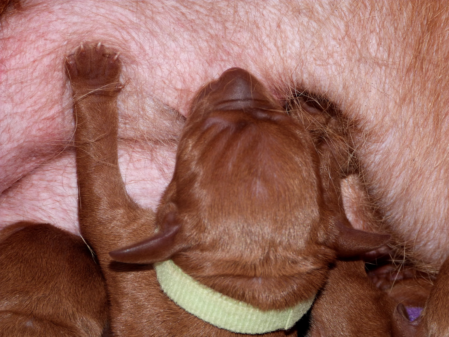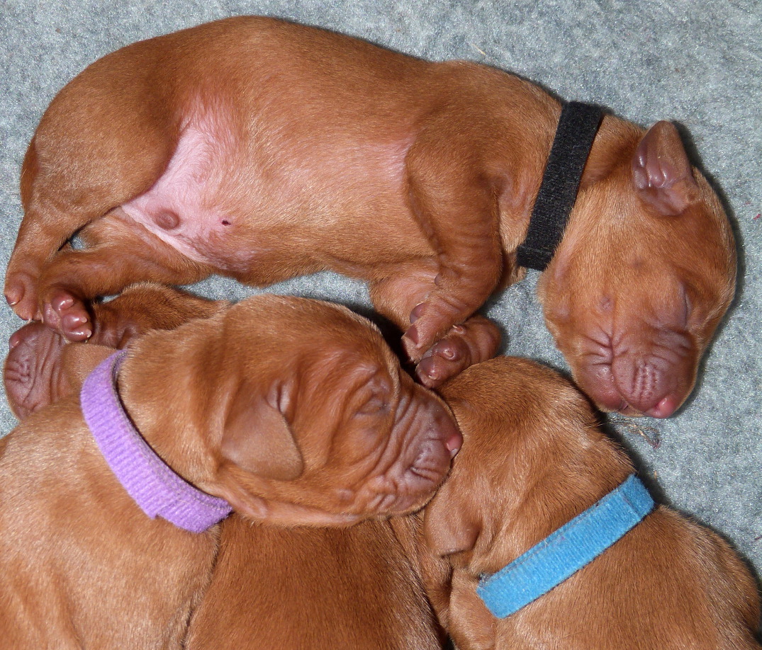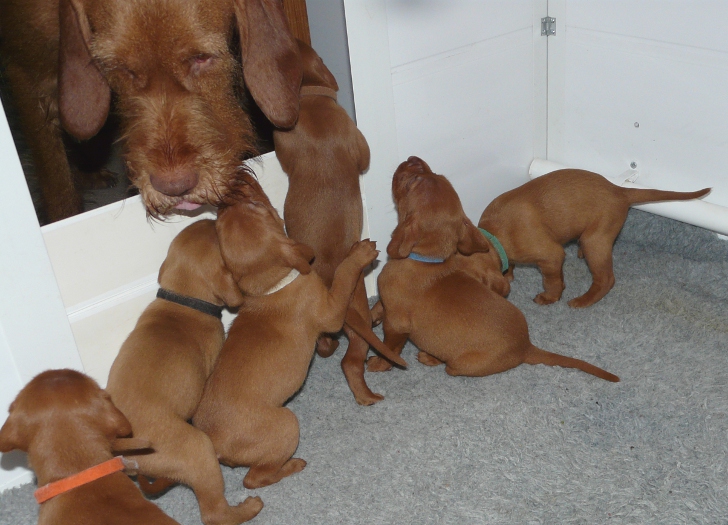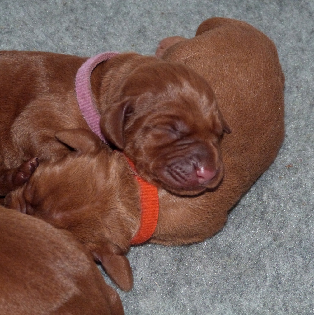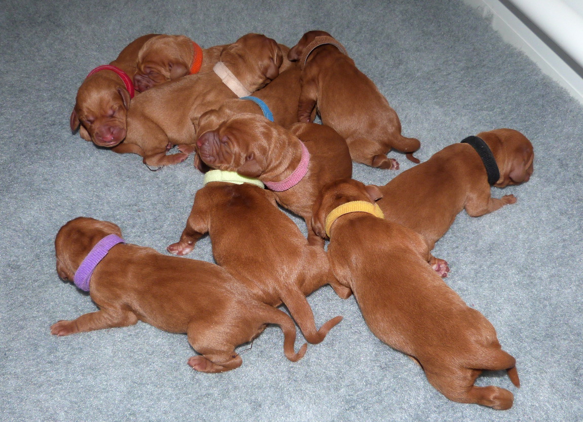 Yesterday was a very long and exhausting all-night-and-most-of-the-next-day whelping, but all 10 pups eventually arrived vigorous and squeaking and all suckled strongly immediately, so now, 24hrs later, we are very proud to be able to introduce Belatarr 3.0 to the world: 6 new Belatarr girls – Miss Yellow, Miss Orange, Miss Pink, Miss Green, Miss Purple and Miss Mint, and 4 new Belatarr boys – Mr Red, Mr Black, Mr Blue and Mr. Bronze.