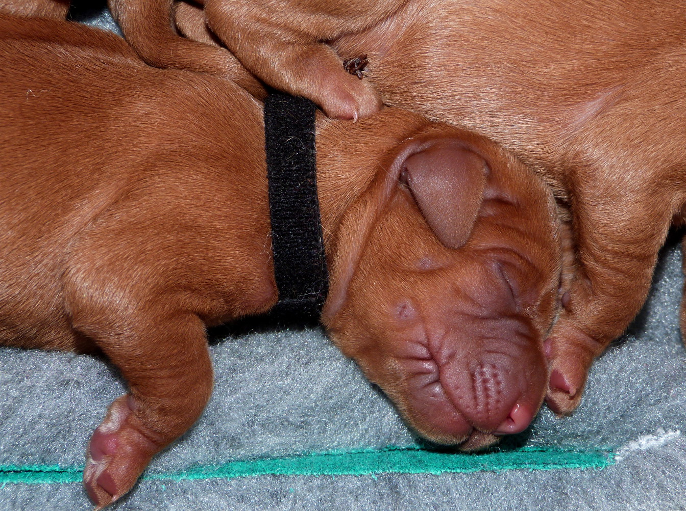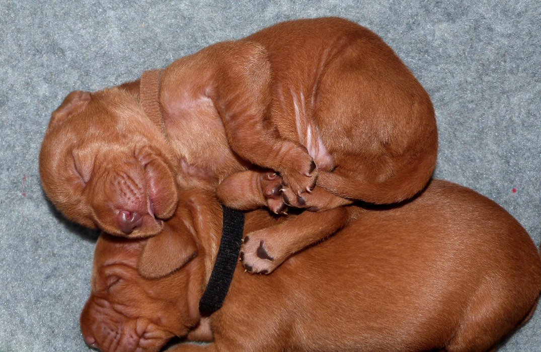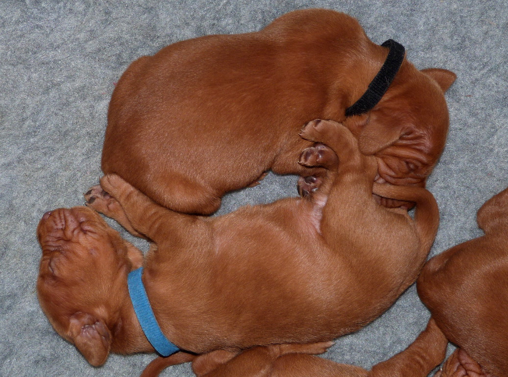 As with Phoenix’ previous litters we have split the puppies into two groups and are hand-attaching them to feed around the clock to ensure that everyone gets their share of milk, so whilst one group feeds the others wait their turn, gently snoozing under the heat lamp. Phoenix is recovering well and sleeping a lot today, but is proving again to be the most wonderful, careful, conscientious and attentive mother. So now the fun begins!