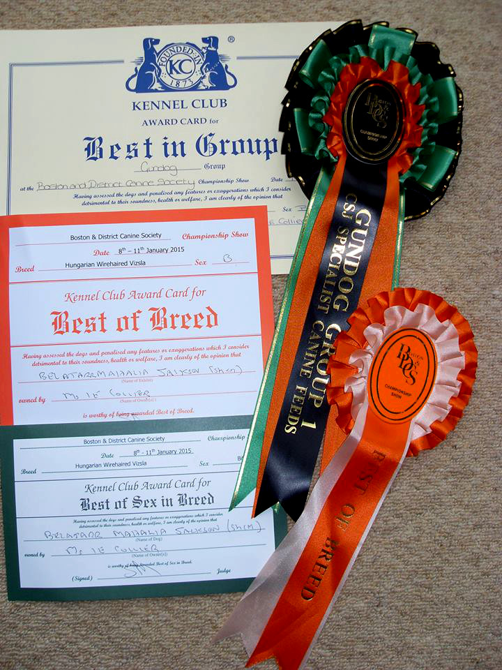 A wonderful day for team Belatarr at the Hungarian Wirehaired Vizsla Club show & annual prize giving at Newark yesterday – a lovely, friendly, happy & very well run show with such a nice atmosphere too. Young Belatarr Hercules started the ball rolling taking 1st Puppy Dog and going on to Best Puppy Dog & Reserve Best Puppy in Show. Big brother Belatarr Charlie Parker won 1st Post Graduate Dog & sister Belatarr Mahalia Jackson was 1st Limit Bitch.