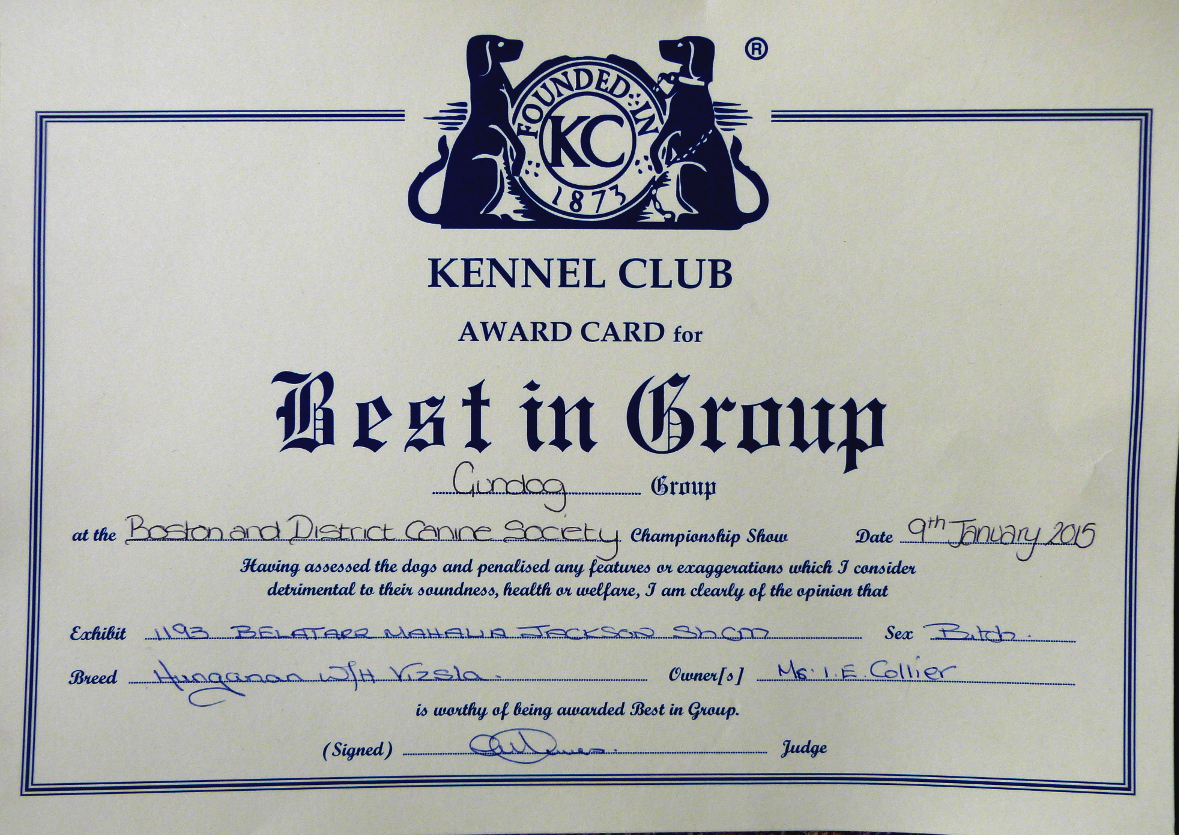 .. my choice for G1 was Belatarr Mahalia Jackson, W/h Vizsla, I was looking for a winner who not only possessed the correct structure but was also sound on the move with good ring presence – this bitch fitted the bill & in addition she was presented in excellent body & muscular condition with a correct wire coat which gave beautiful face furnishings & covered her whole body from the tip of her nose to the tip of her toes. She did not put a foot wrong with her true & steady movement, I feel privileged to have been told afterwards this has given this breed its first group winner.“