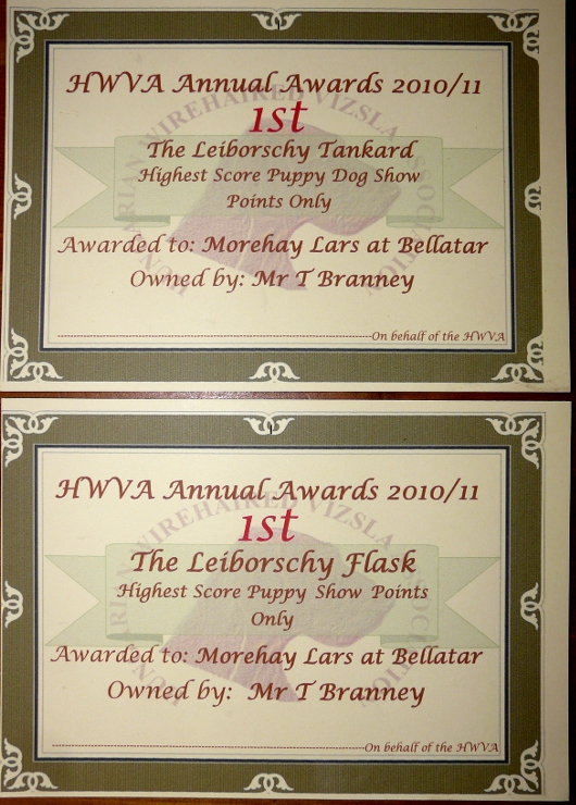 As the tally of points was pinned up and the awards announced it became clear that one of these bitches had beaten the existing Puppy Show Points record by quite a large margin…but Mingus had managed to go ever further and, with his score of 581 points, took Top Puppy Dog, winning the Leiborschy Tankard, and then Top Puppy of the year, allowing Belatarr to retain the Leiborschy Flask that Phoenix won for us last year. In the process Mingus also set a new record for the highest score ever attained by a UK HWV show puppy. Needless to say we were brimming over with pride at our boys amazing achievements – what a day to remember!!