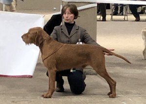 “From an impressive line-up of BOBs, I shortlisted 4 for further consideration…. RBIS Forster’s Belatarr Venus. Hungarian Wire Haired Vizsla. A bitch with substance whilst remaining feminine. Head and expression typical of her breed. Correct reach of neck into well-laid shoulders. Big ribbed body. She stands on well-boned legs with good feet. Presented in hard condition and in good harsh wiry coat. Moved well with reach and drive.“