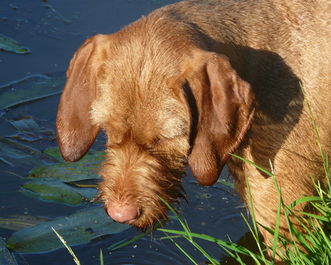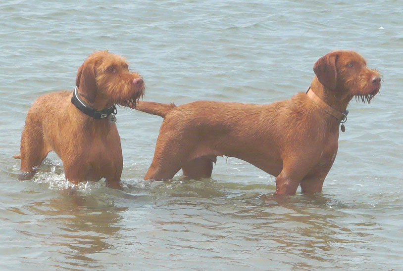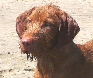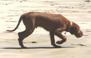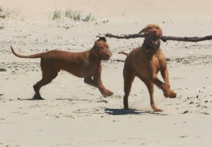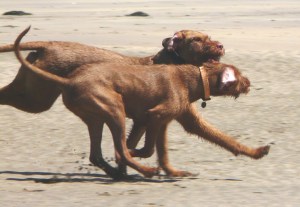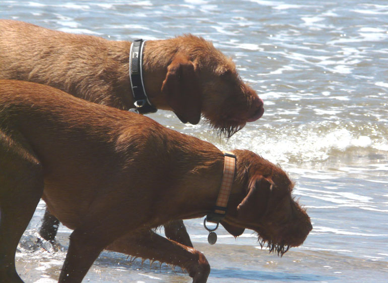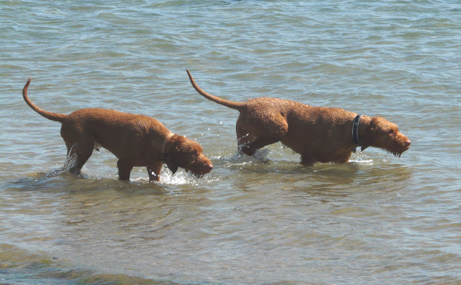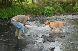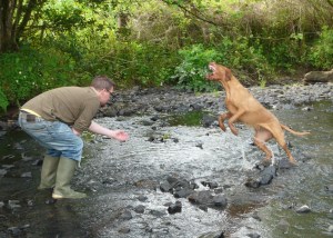Phoenix has a hobby, and one that we’ve never got around to documenting on the blog before. She loves, and I do mean LOVES, for inanimate, “previously-still-things” – sand, soil, mud, and most especially water – to come alive and start to move. Of course she loves hurtling around after deer, pheasants, sticks, toys as much as the next gundog, but she saves her most intense concentration and her most excited response for when she gets to act as goalie and dives this way and that to catch “previously-still-things.” Mingus can be quite obliging, and when he’s digging in the soil or sand Phoenix invariably positions herself right behind to catch the flying dirt….