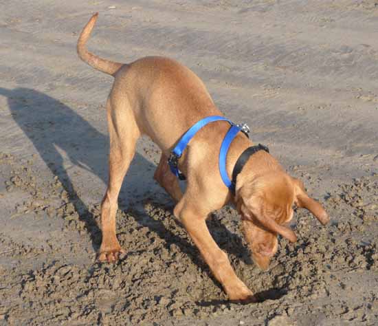 As soon as we hit the beach we met up with two local Vizsla girls and their human companion, so we all had a good chin-wag about all things Vizsla whilst the three girls had an extended sandy romp. Then it was on to the main business of the day: sloshing through sea puddles, lots of digging and hunting for driftwood, watching seabirds in the distance and all the while wondering why the salt water tastes so odd.