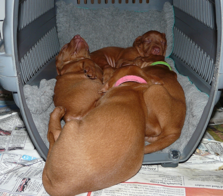 When indoors and out the pups love nothing more than to pile into one or other of their cat-carrier dens, which have been equally enjoyed by all of their older brothers and sisters before them.