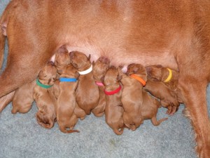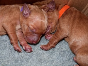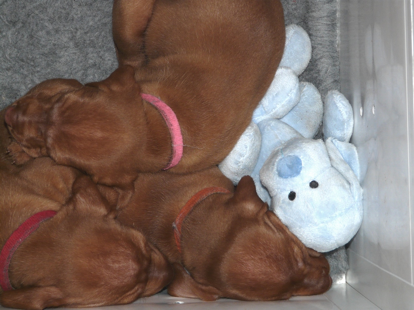As with all of our previous litters the large number of puppies necessitates splitting them into two teams and letting one team feed whilst the other snoozes together under the heat lamp. The teams are then switched round every 90 mins or so, night and day, ensuring that everyone gets an even amount of milk, so much work and disrupted sleep lies ahead!