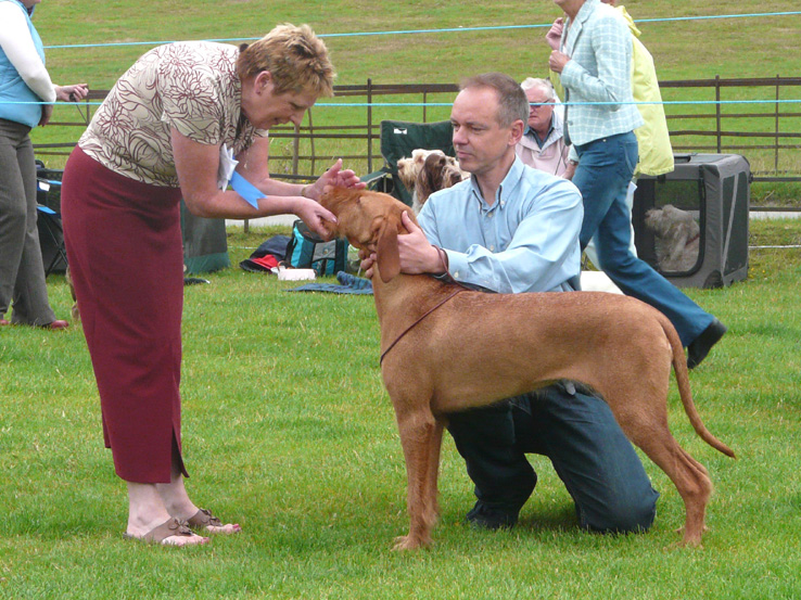 In total contrast Aug 8th was one of the few hot sunny days of the summer. Remembering back to her very first show back in the baking heat of May we realised that Phoenix would not show well if she was hot, so we kept her in the cool shade of an unused marquee and also kept damping her down with cold water. The previous breed over-ran by several hours and by the time we did get to the ring, despite our efforts at cooling, Phoenix was very sleepy and floppy. She stood nicely, but her gaiting was perfunctory and pretty unenthusiastic…not much Phoenix *sparkle* on view in the ring today and we were awarded 3rd Best Junior Bitch.