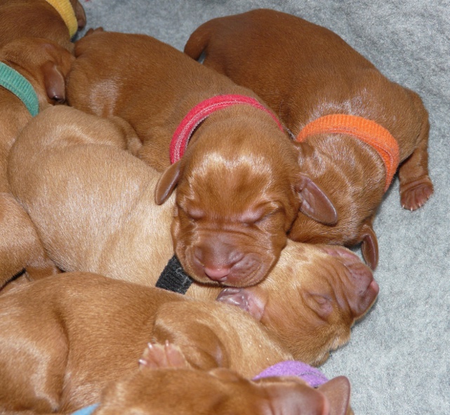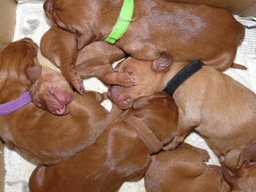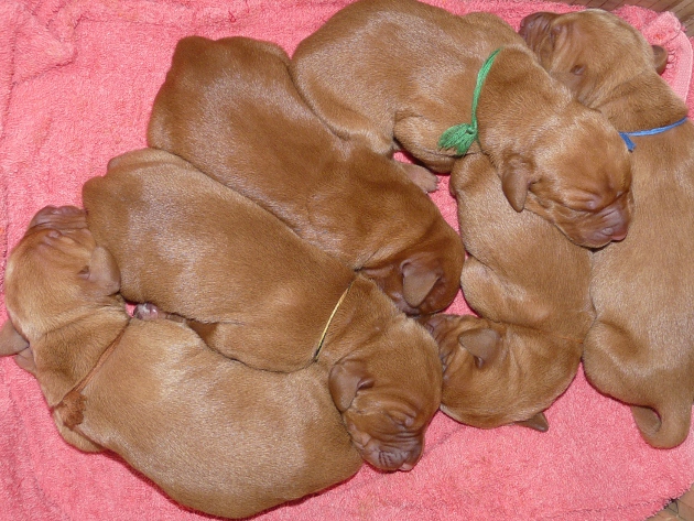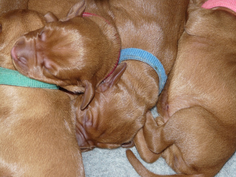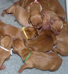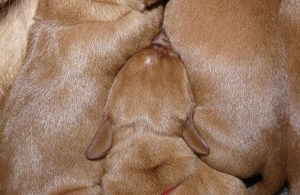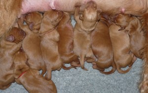 Once they had all arrived, then the fun really began…with a litter of this size (and only 6 decent teats to feed from)  we have, from a few hours after the final birth, had to split the pups into two teams, and feed each team separately to ensure that everyone gets a good meal and that the bigger boys don’t muscle out the smaller girls. This we do every 2 to 3 hours, day and night, so sleep has become something of a fond and distant memory, but who needs sleep when there are puppies on board…