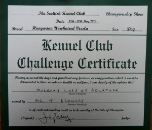 This last weekend saw Tim & crew set off on the 950-mile round trip to the Scottish Kennel Club Championship Show at the Royal Highland Showground on the outskirts of Edinburgh.  Mingus was up against the big boys in his first Champ Show Open class, presided over by breed expert Jonathan Parry. Despite being the youngest in the class Mingus well-and-truly rose to the occasion, driving round the ring in great style, and we were absolutely thrilled when he was awarded 1st Open Dog – beating the Crufts 2012 Best of Breed, along with the only UK male Champion HWV plus the only male currently with 2 CC’s in the process.