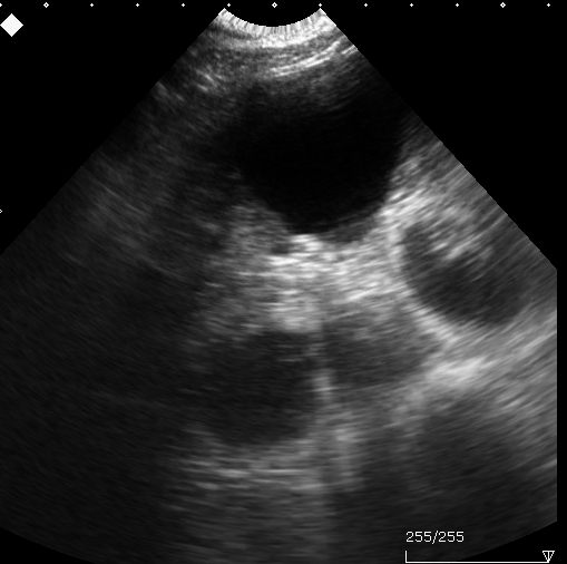 This snapshot shows a few of the pups as they are now, at 31 days gestation, only around 1cm in size and each sitting at the top of a gestational sac (the dark, circular areas on the image). Amazing to think that these small marble-sized embryos will have grown to the size of  plump guinea-pigs in just another 4 weeks or so! We saw approx 7 or 8 pups, which is exactly the same result as our 2011 litter, which turned out to comprise 12 pups…