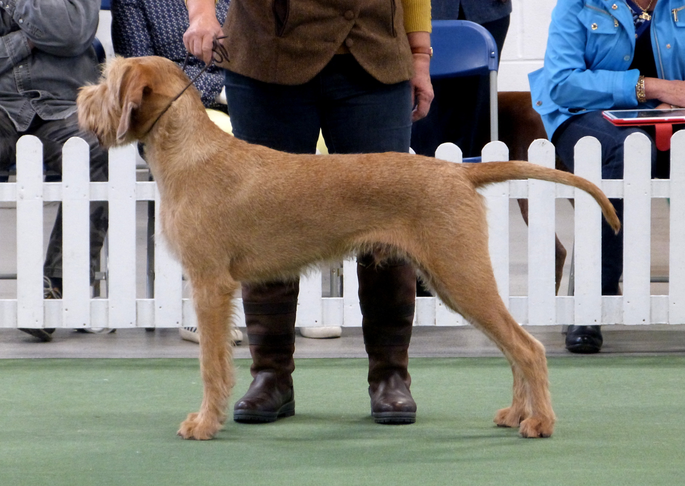 “I make no secret of the fact that I have liked this bitch before. This is the third time I judged her, first time she wasn’t ready, second time she was the best bitch but boy look at her now! Now the finished package and am very surprised that she is still wanting her third CC. So very feminine in outline & outlook, such a pretty head & expression, I love her type, she is balanced & quality & is everything I want in a Hungarian Wirehaired bitch. She moved so true on well boned legs & feet, excellent neck & shoulders, strong topline & well set tail, good depth of chest, moved with ease & style covering the ground with an excellent head carriage & tailset, the bonus is that she has an excellent coat of the correct harshness & a beard, not an overlarge one, as I am know to prefer less, but just enough for perfection, her muscletone just gleamed on a sunny day, even though we were inside, when the sun caught her going round in profile, it completed the picture. Thrilled to give her the CC & BIS“