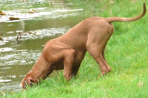 A while back, whilst trotting around and investigating the pond, Mingus found himself on the opposite side of the water to us. Rather than trot back the way he’d come he simply plunged into the water and swam directly across to us (the pond is 6 foot deep and 150 foot long…) He’d never previously gone more than about ankle deep in water, so it came as something of a surprise to us – as well as to him – that he could indeed swim so well. On arriving at the other side he looked enormously pleased with himself and has been pretty keen to get wet in the pond and the river ever since.