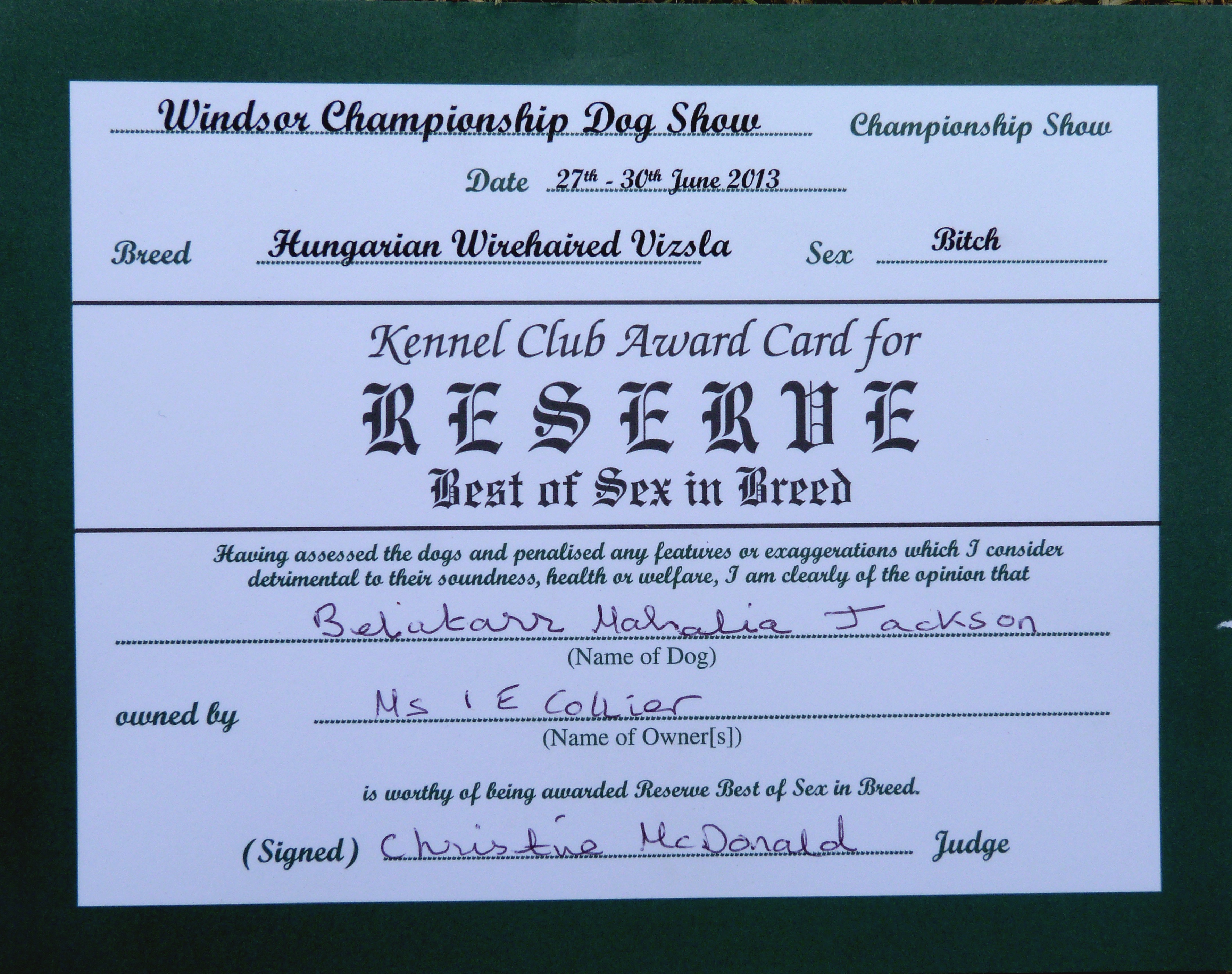 “Lovely bitch, super shape, in harsh body coat. Super head, just right in neck, shoulders, bone and feet, well sprung ribs carried well back. Good topline, excellent hindquarters and very sound on the move. RBB”